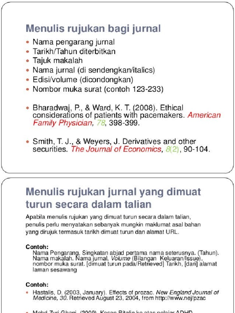 Pilih jurnal yang relevan. Rujukan Lengkap Untuk Buku Rujukan lengkap bagi buku hendaklah dimasukkan maklumat menurut urutan berikut. Contoh Penulisan Rujukan Mengikut Format APA 1.