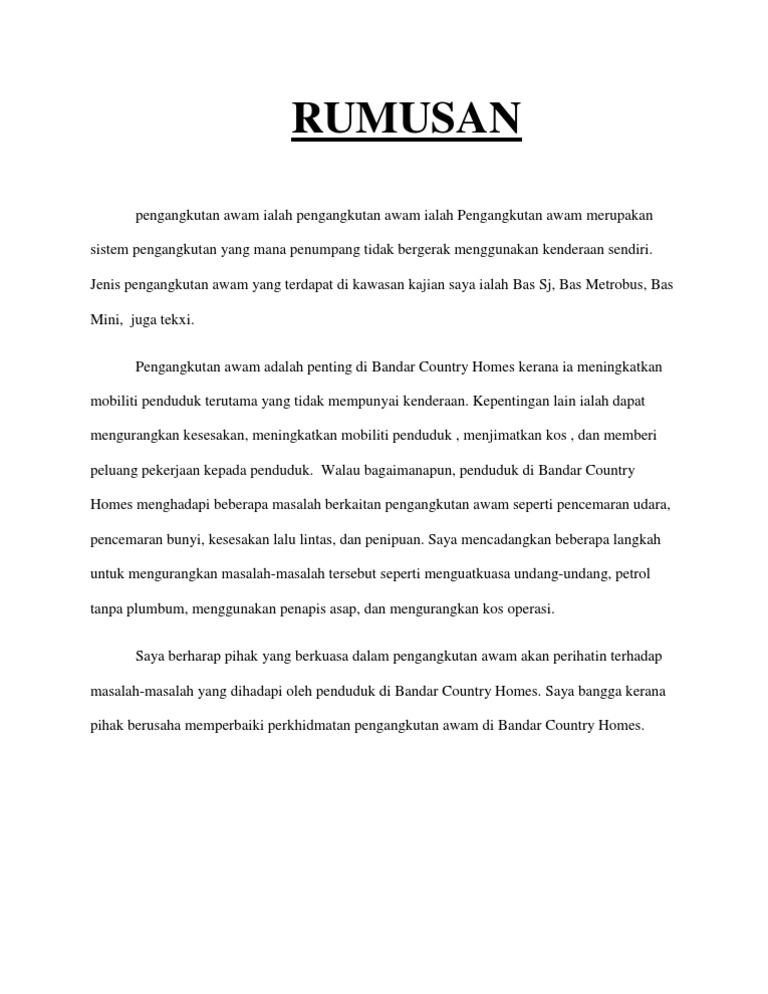 Menurut kamus dewan dan pustaka edisi keempat pula pengangkutan awam dapat didefinisikan sebagai sistem pengangkutan bermotor seperti teksi bas dan kereta api yang digunakan oleh orang ramai di kawasan tertentu dengan kadar tambang. Semoga perkongsian bahan-bahan rujukan panduan bahan pembelajaran dan pengajaran contoh-contoh karangan sumber rujukan PT3 Pentaksiran Tingkatan 3 tingkatan 1 tingkatan 2 tingkatan 3 dalam post di blog Bumi Gemilang berguna dan dapat membantu para pelajar. Bebaskan cukai ke atas pengangkutan hibrid 4.