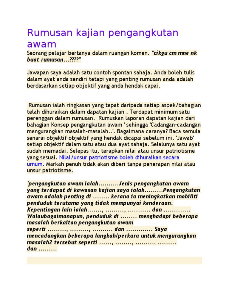 This Right Here Is A Genuine My friend made it geografi assignment. 2 HASIL KAJIAN Konsep pengangkutan awam Menurut Pusat Rujukan Persuratan Melayu Kamus Pelajar Edisi Kedua pengangkutan awam ialah sistem pengangkutan bermotor seperti teksi bas dan kereta api yang boleh digunakan oleh orang ramai di kawasan tertentu dengan kadar tambang yang telah ditetapkan.